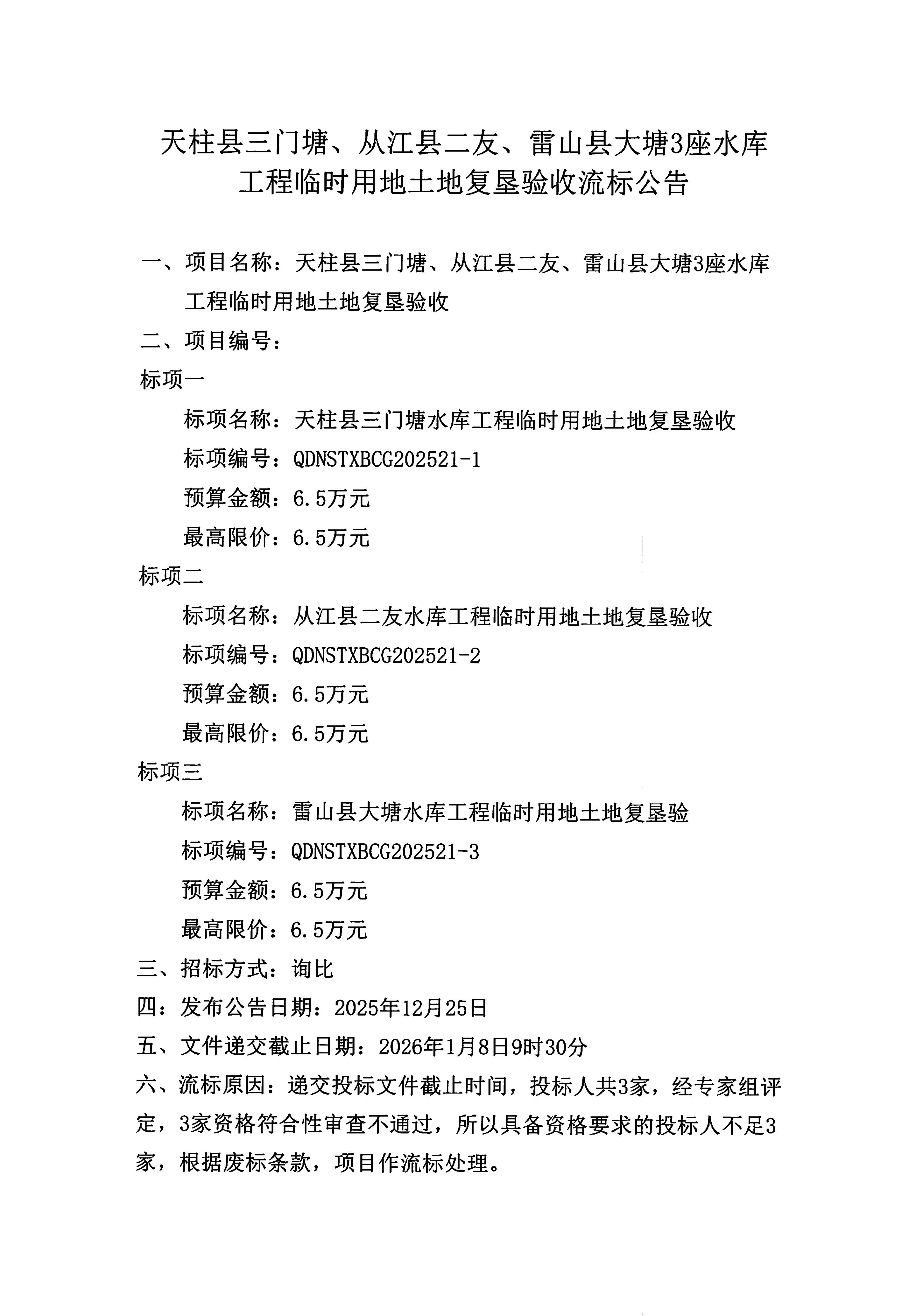 天柱縣三門塘、從江縣二友、雷山縣大塘3座水庫工程臨時用地土地復墾驗收流標公告